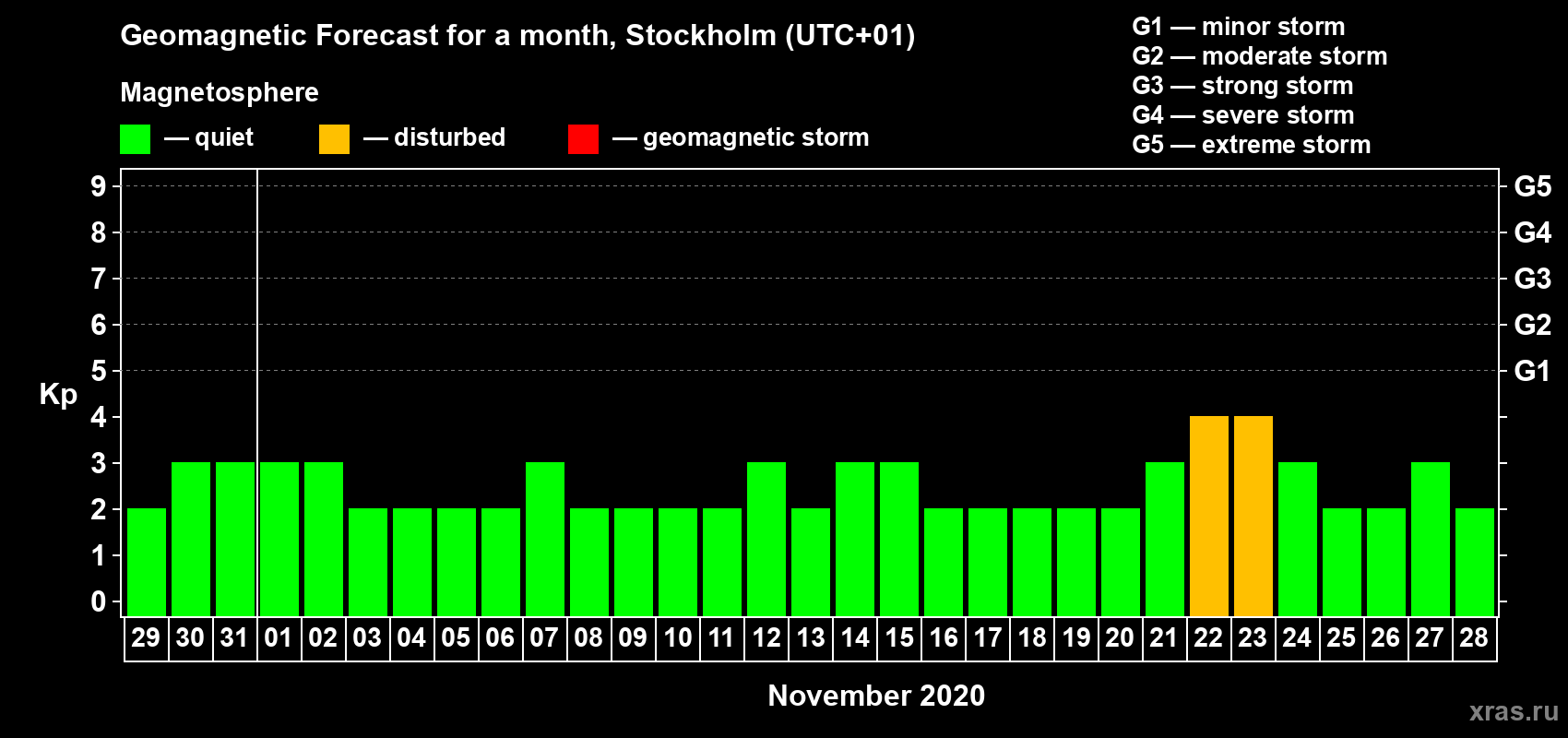 Geomagnetic storm forecast in Stockholm for Oct 29, 2020
