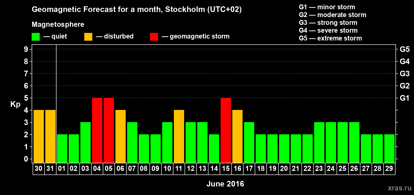 Geomagnetic storm forecast in Stockholm for May 30, 2016