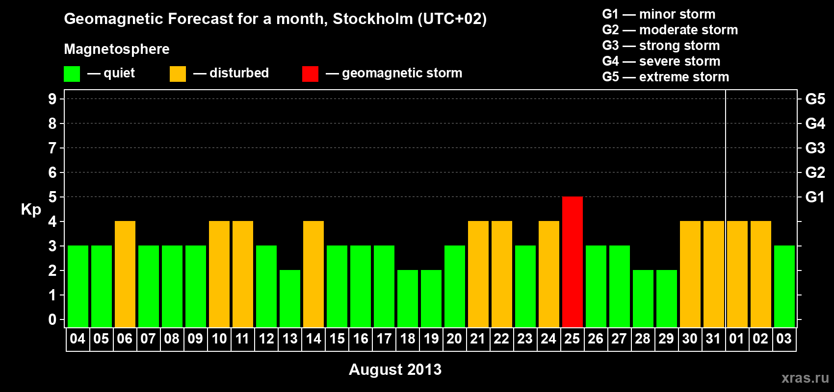Geomagnetic storm forecast in Stockholm for Aug 04, 2013
