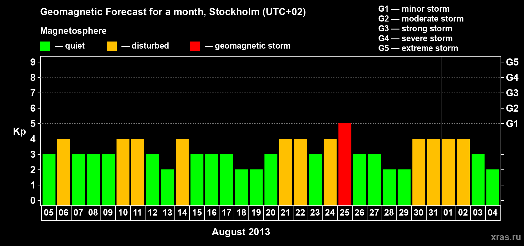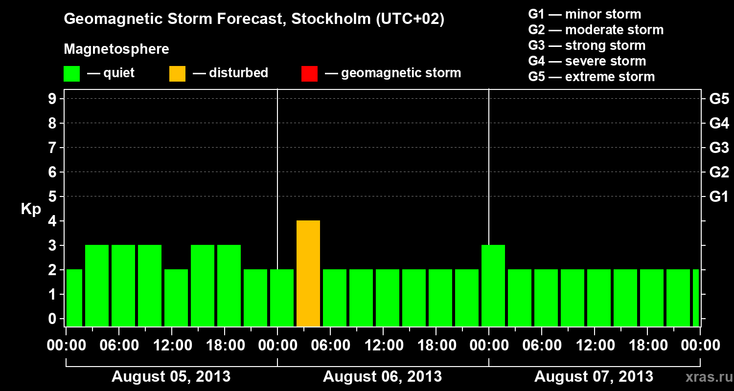 Geomagnetic storm forecast in Stockholm for Aug 05, 2013