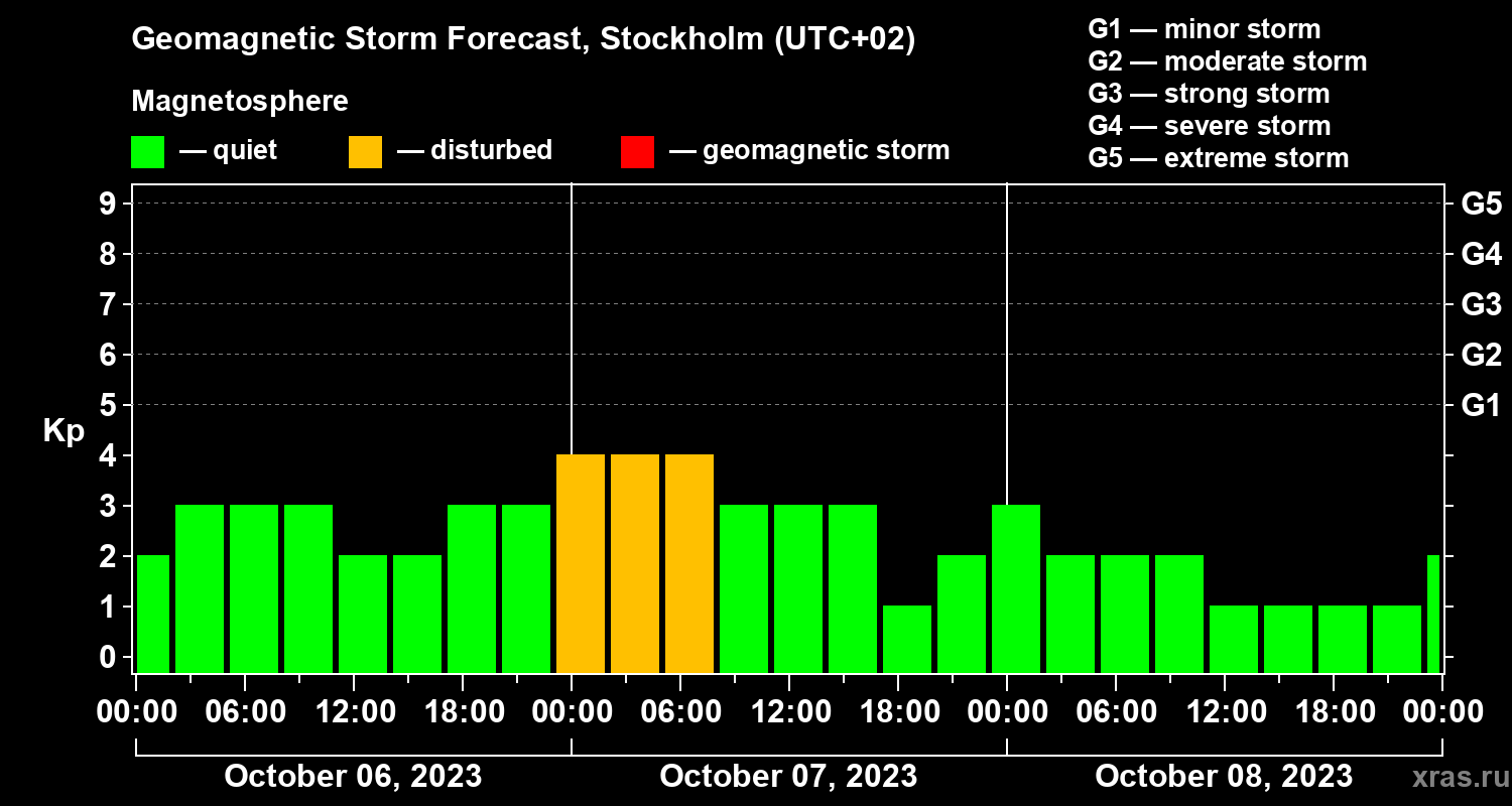 Geomagnetic storm forecast in Stockholm for Oct 06, 2023