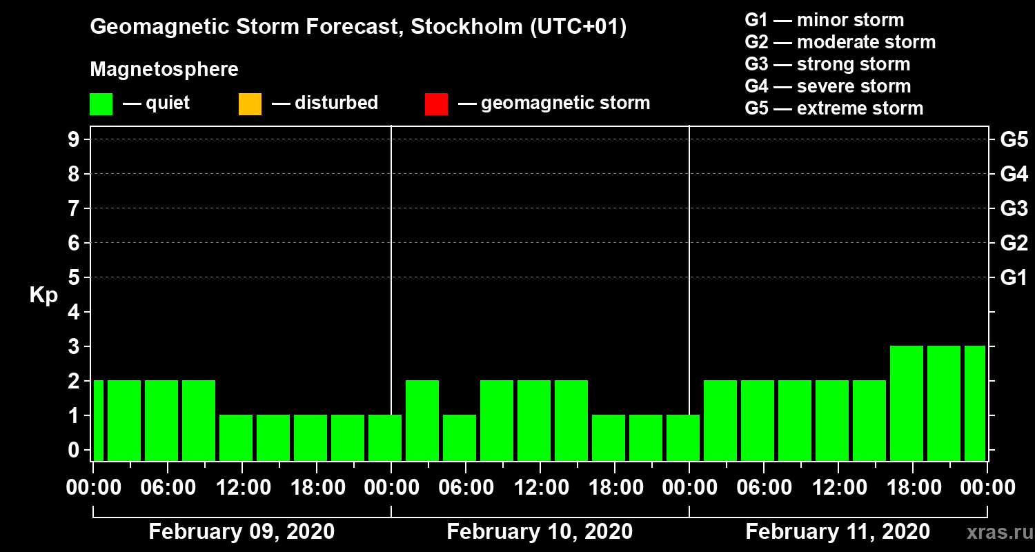 Geomagnetic storm forecast in Stockholm for Feb 09, 2020