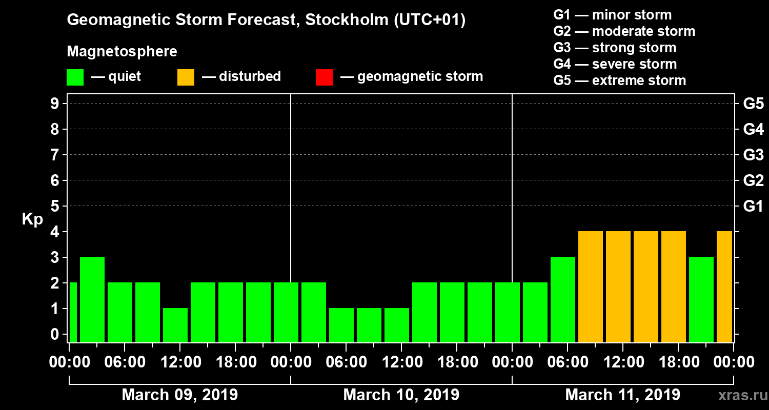 Geomagnetic storm forecast in Stockholm for Mar 09, 2019