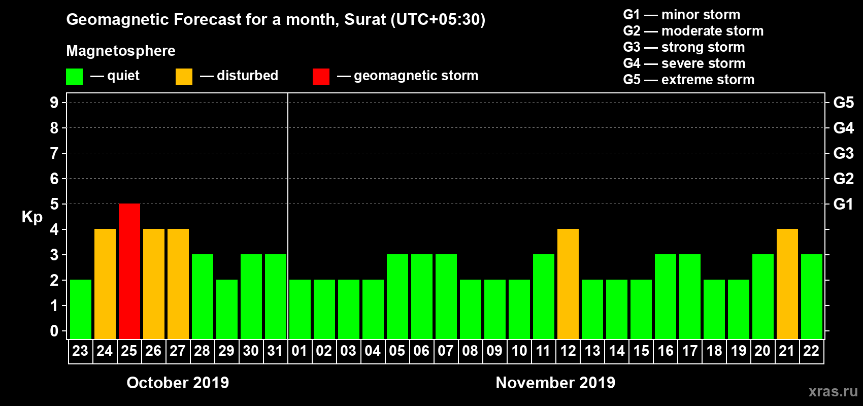 Geomagnetic storm forecast in Surat for Oct 23, 2019