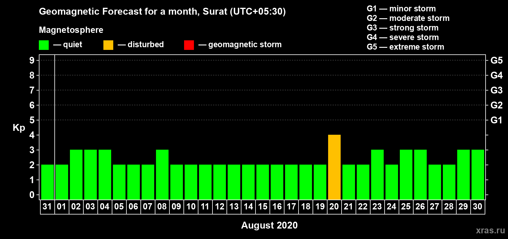 Geomagnetic storm forecast in Surat for Jul 31, 2020