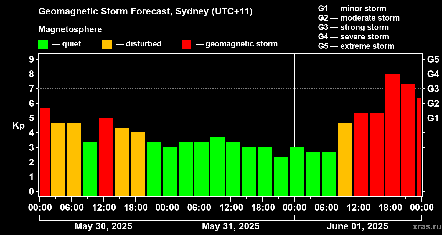 Geomagnetic storm forecast in Sydney for May 30, 2025