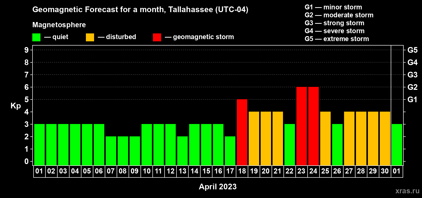 Geomagnetic storm forecast in Tallahassee for Apr 01, 2023