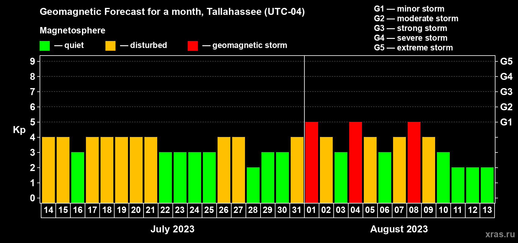 Geomagnetic storm forecast in Tallahassee for Jul 14, 2023