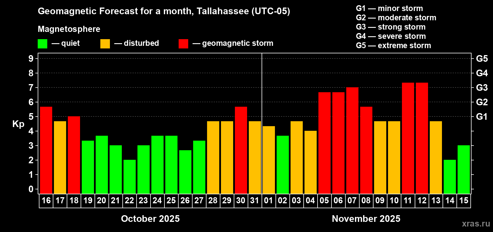 Geomagnetic storm forecast in Tallahassee for Oct 16, 2025