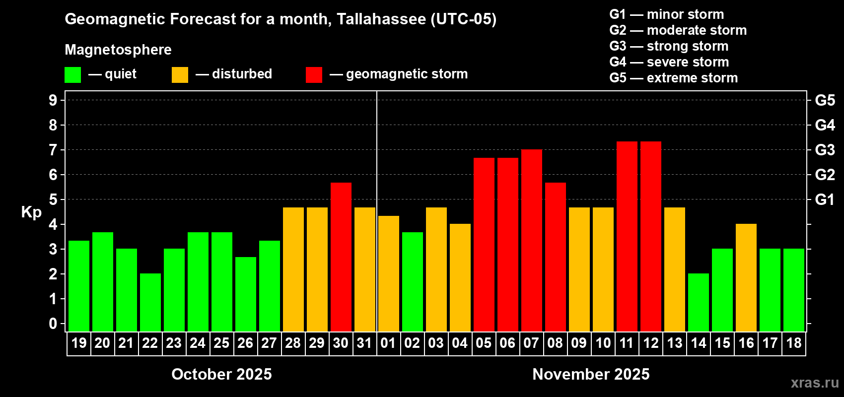 Geomagnetic storm forecast in Tallahassee for Oct 19, 2025