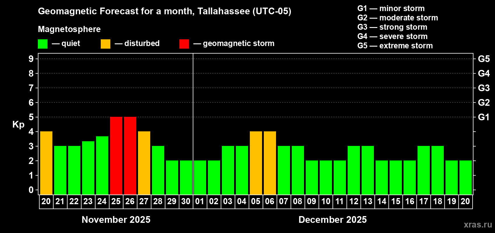 Geomagnetic storm forecast in Tallahassee for Nov 20, 2025