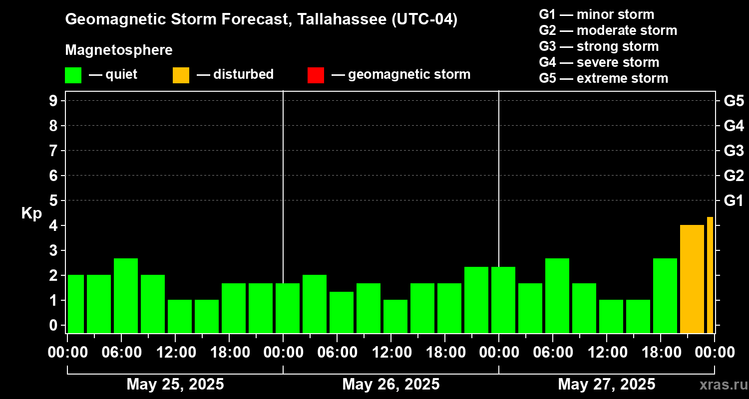 Geomagnetic storm forecast in Tallahassee for May 25, 2025