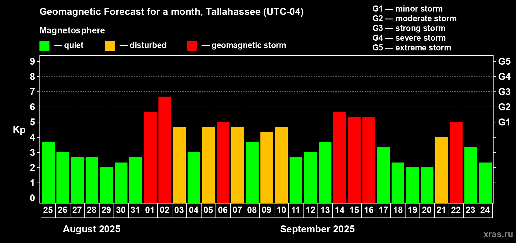 Geomagnetic storm forecast in Tallahassee for Aug 25, 2025