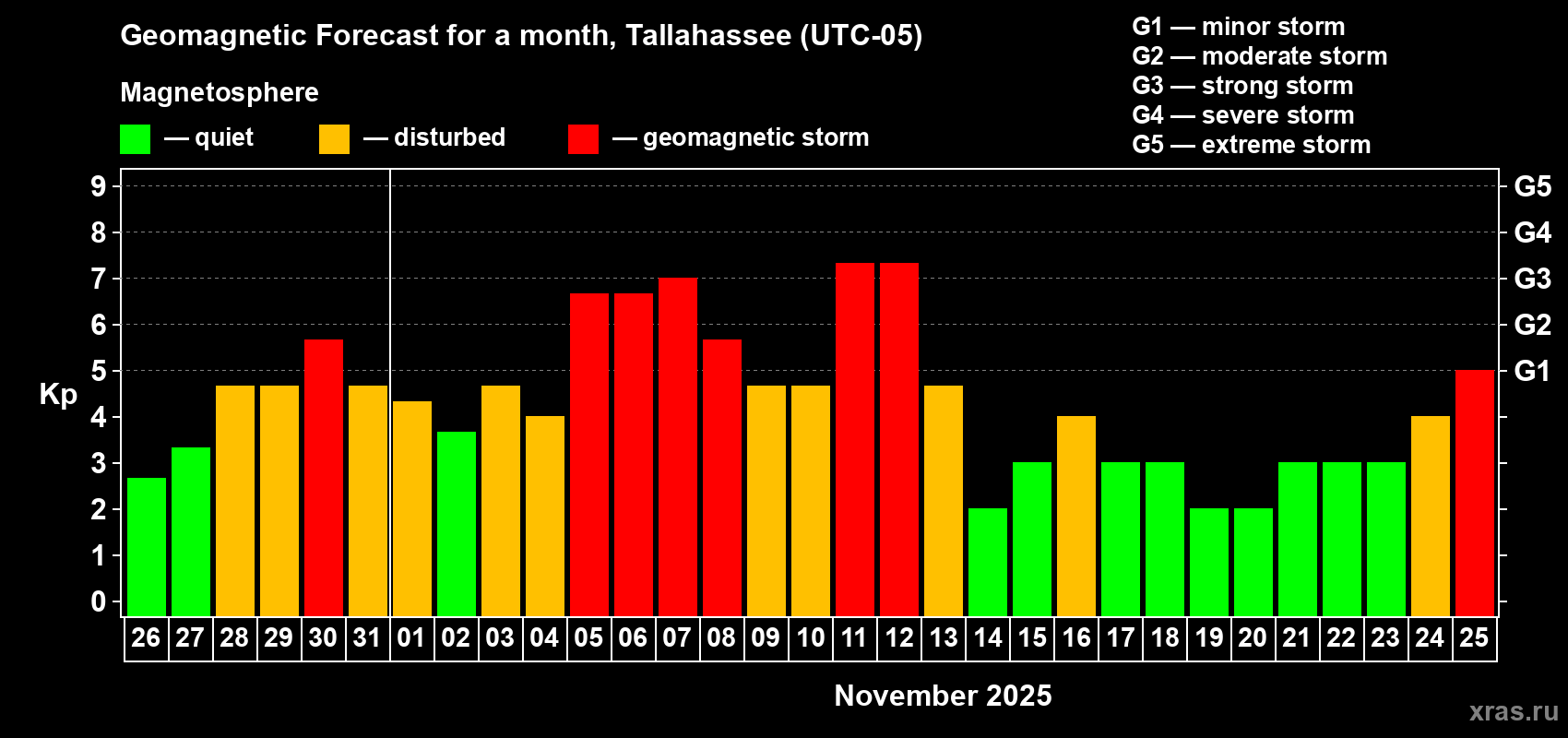 Geomagnetic storm forecast in Tallahassee for Oct 26, 2025