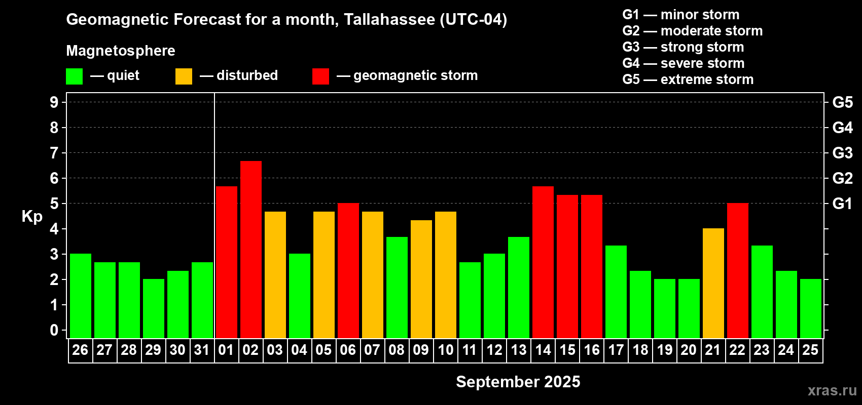 Geomagnetic storm forecast in Tallahassee for Aug 26, 2025