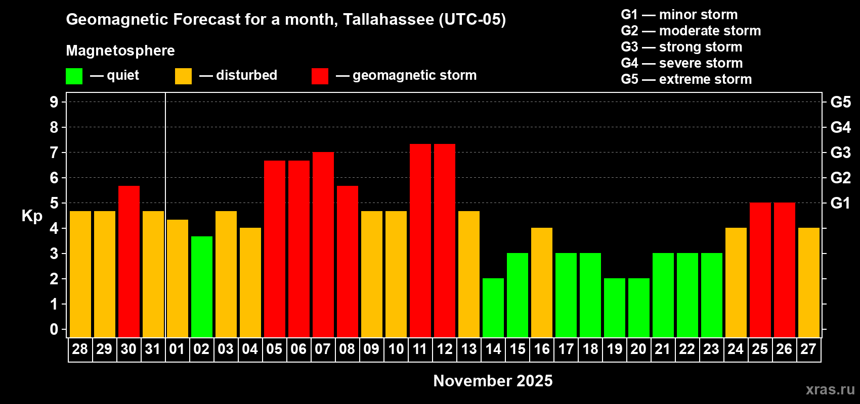 Geomagnetic storm forecast in Tallahassee for Oct 28, 2025