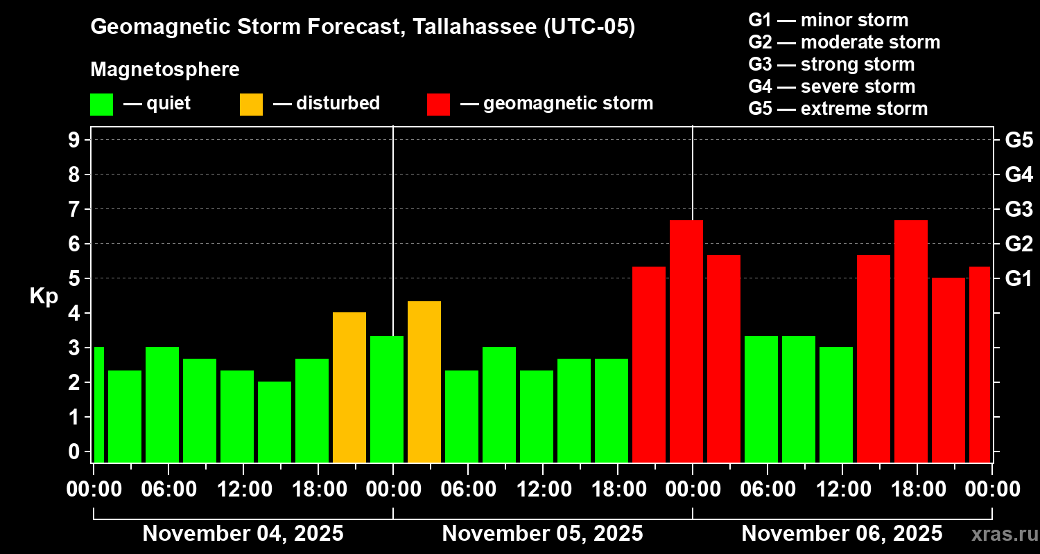 Geomagnetic storm forecast in Tallahassee for Nov 04, 2025