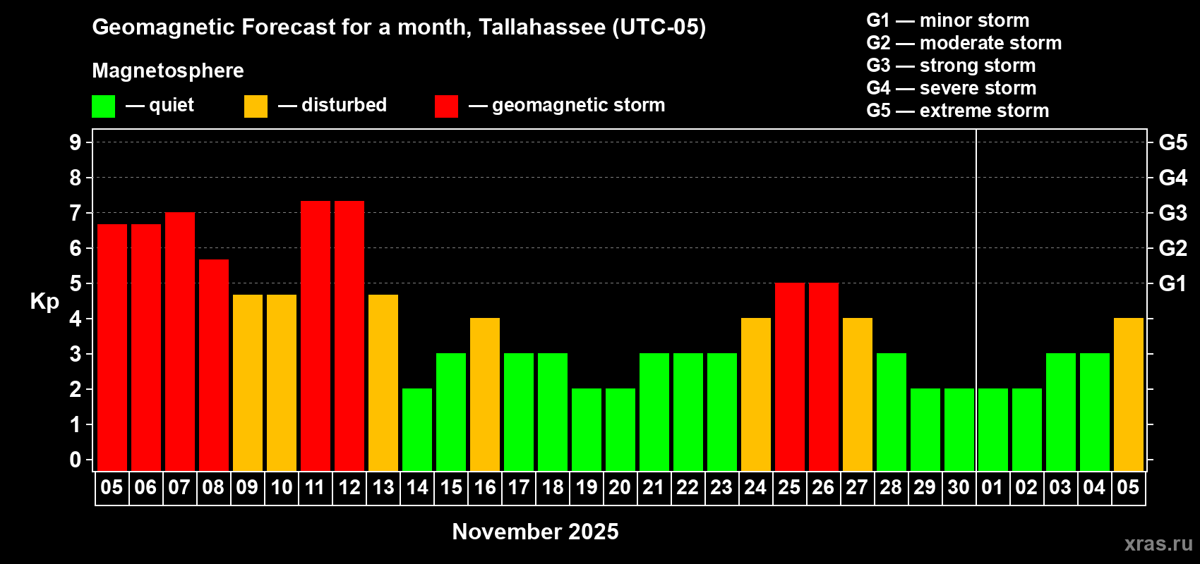Geomagnetic storm forecast in Tallahassee for Nov 05, 2025