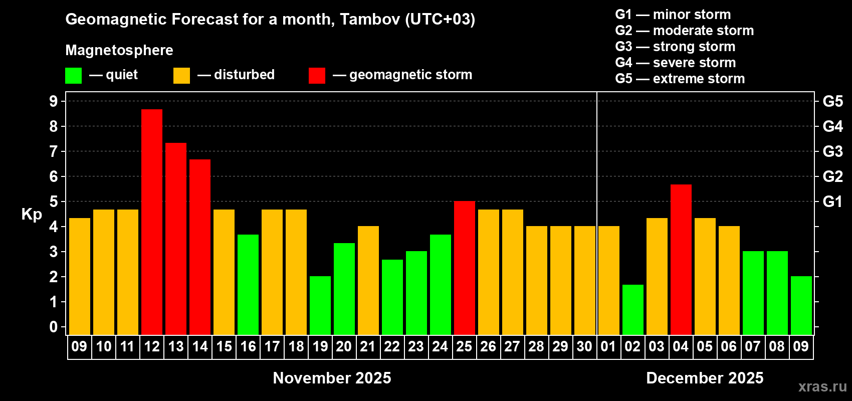 Geomagnetic storm forecast in Tambov for Nov 09, 2025