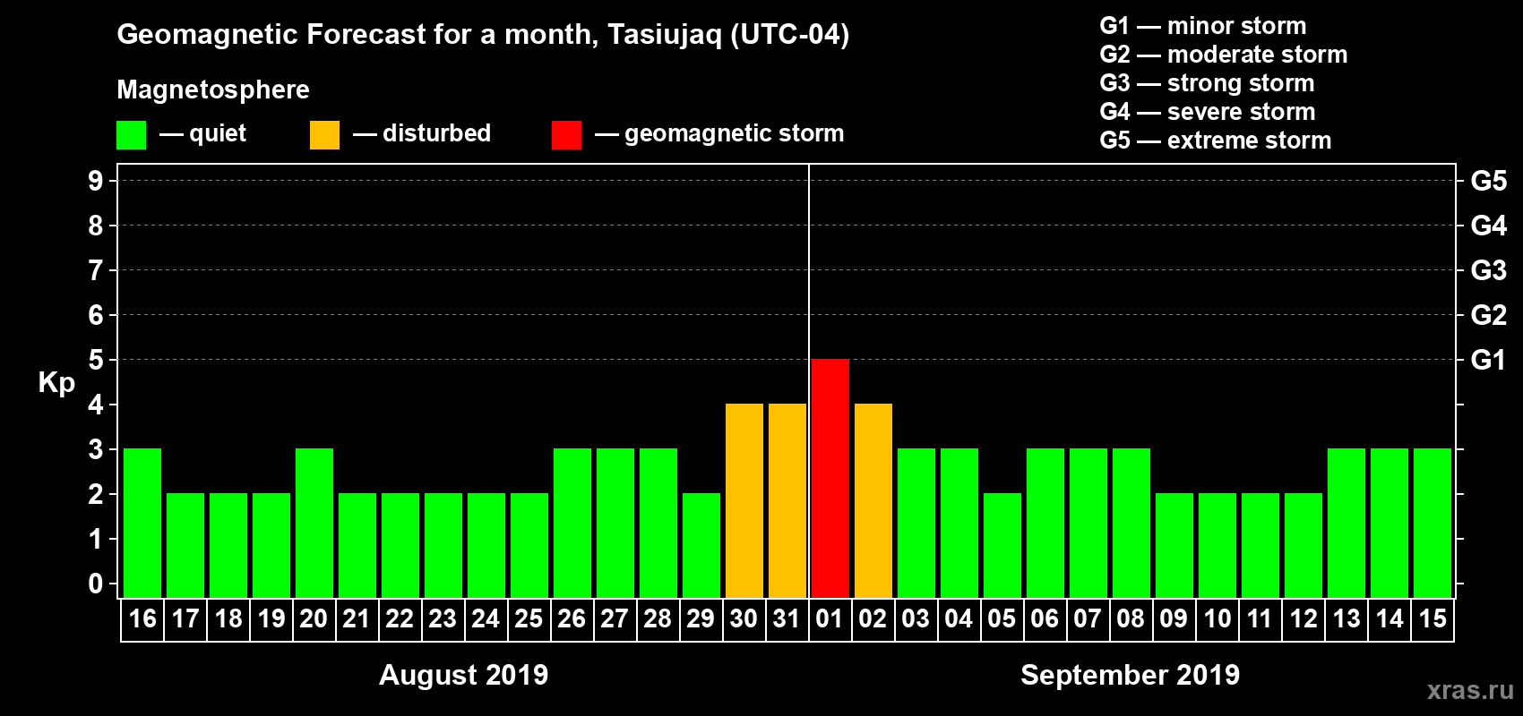 Geomagnetic storm forecast in Tasiujaq for Aug 16, 2019