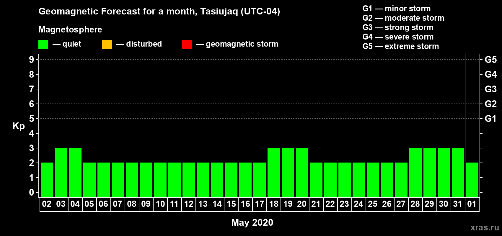 Geomagnetic storm forecast in Tasiujaq for May 02, 2020