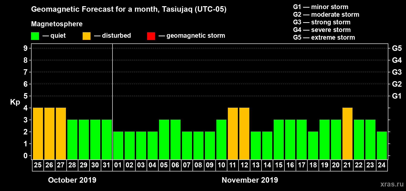 Geomagnetic storm forecast in Tasiujaq for Oct 25, 2019