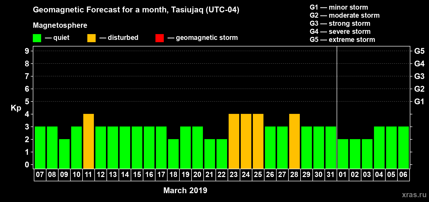 Geomagnetic storm forecast in Tasiujaq for Mar 07, 2019