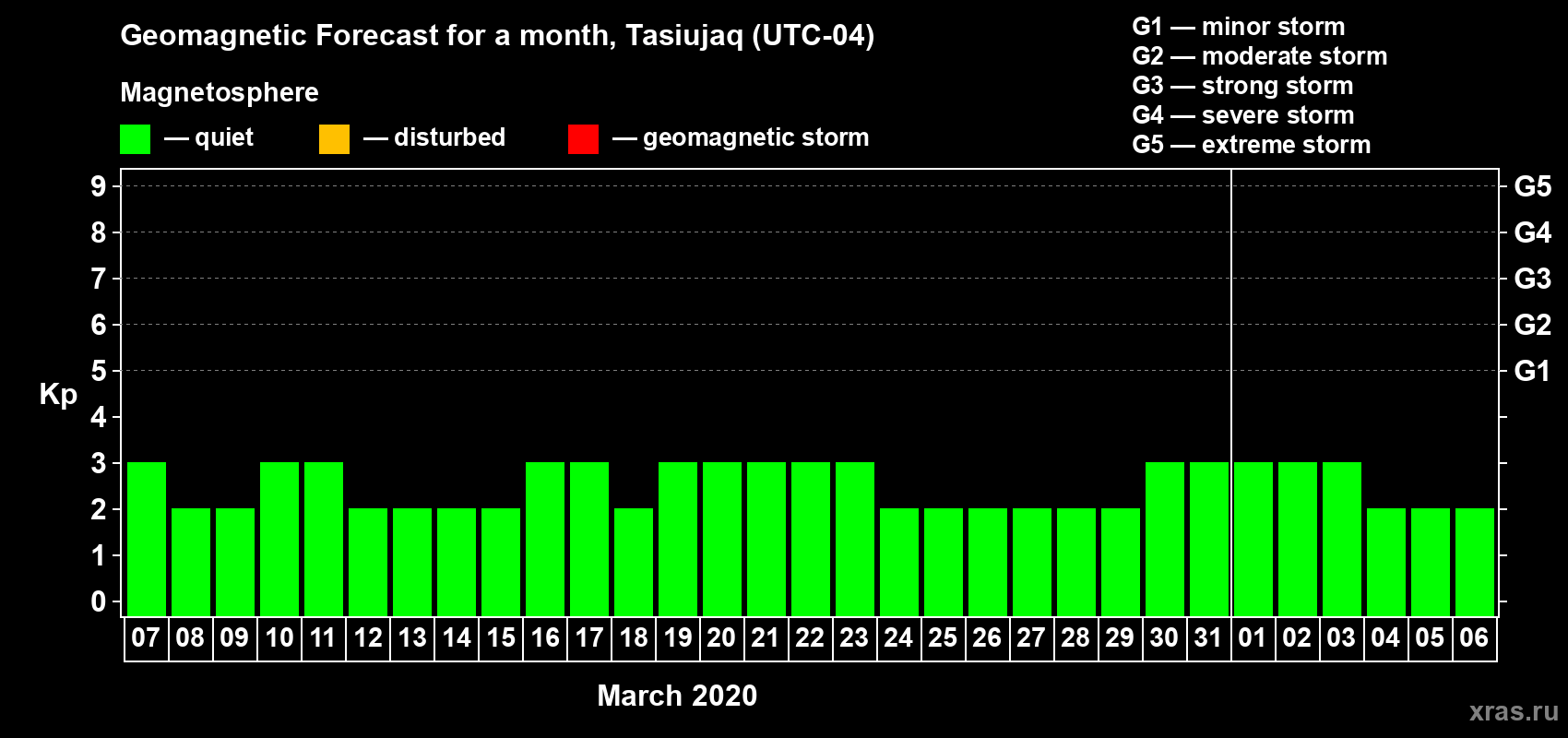 Geomagnetic storm forecast in Tasiujaq for Mar 07, 2020