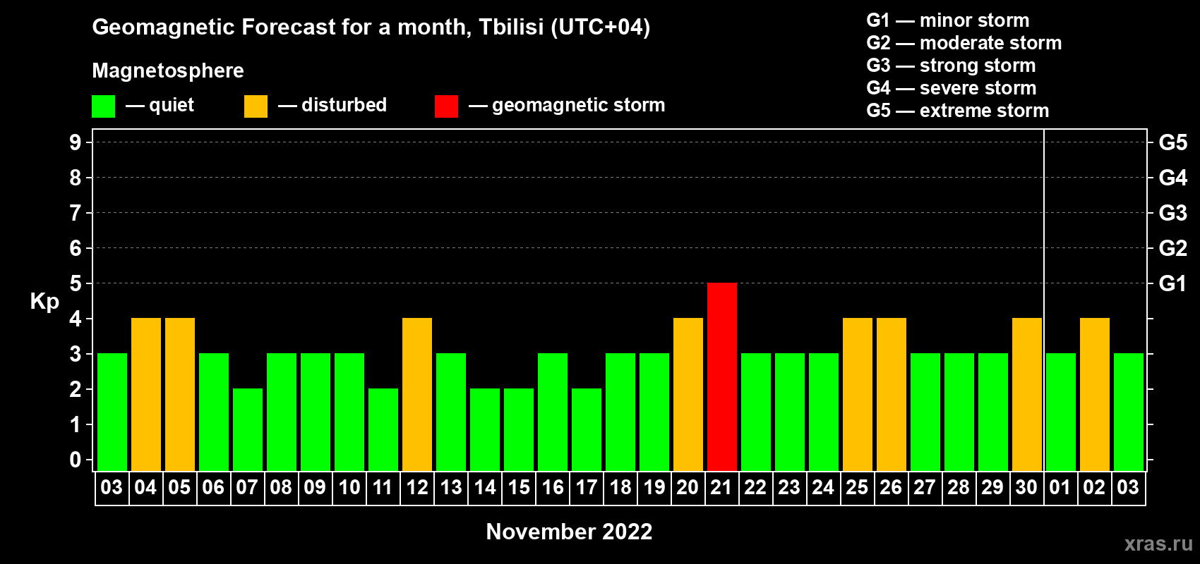Geomagnetic storm forecast in Tbilisi for Nov 03, 2022