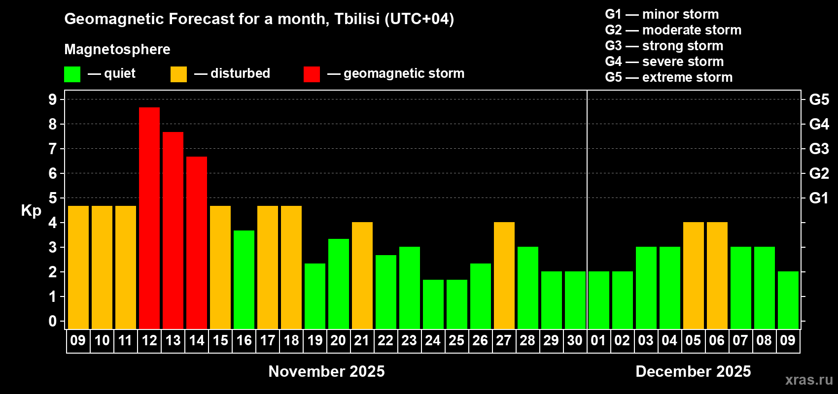 Geomagnetic storm forecast in Tbilisi for Nov 09, 2025