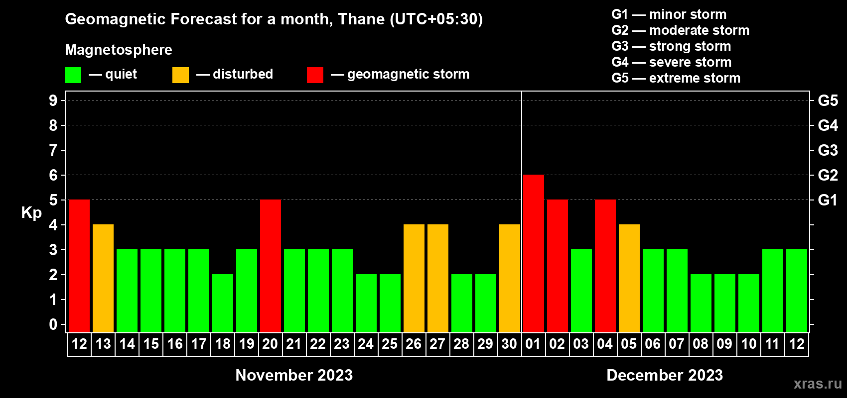 Geomagnetic storm forecast in Thane for Nov 12, 2023