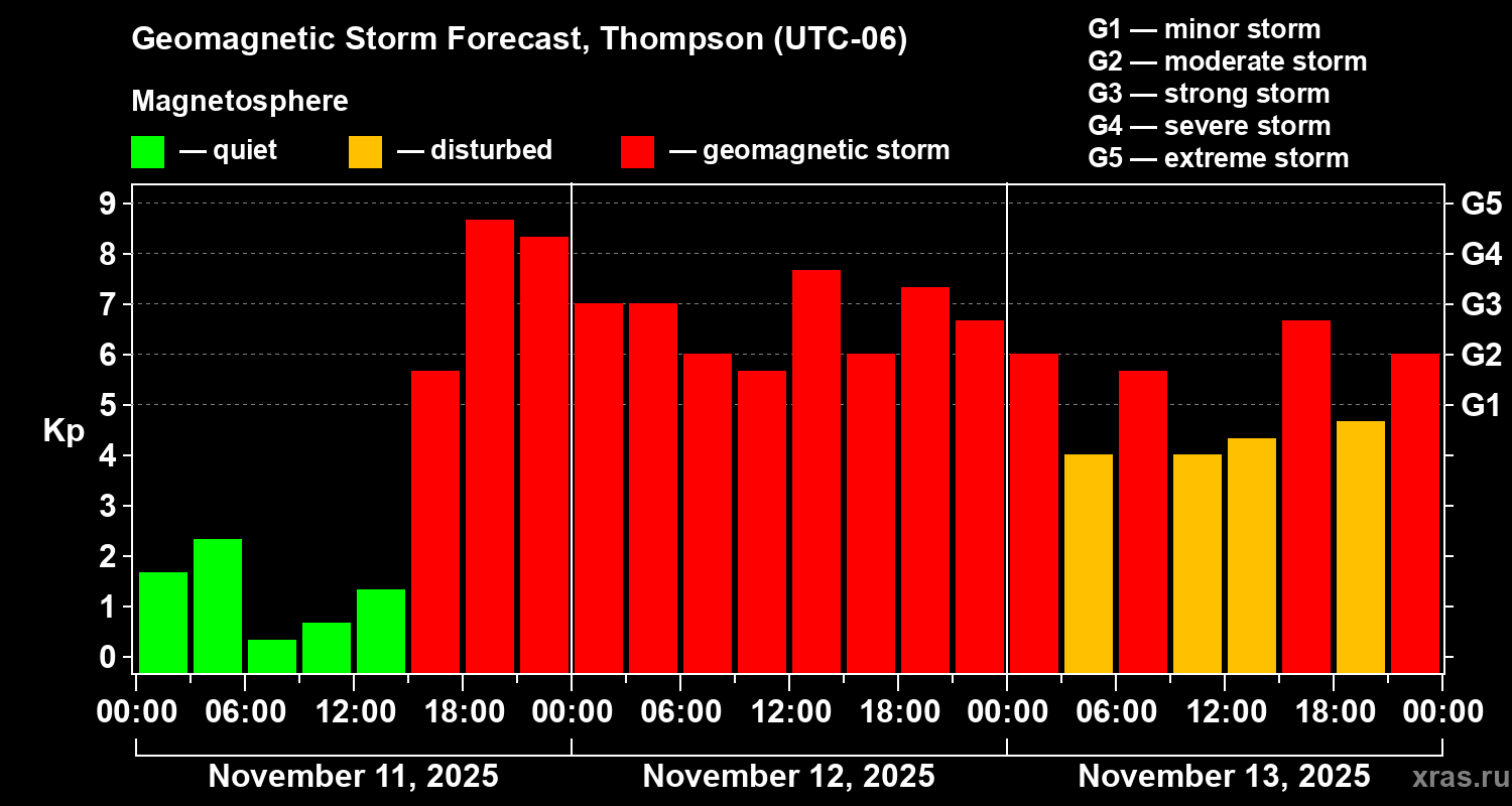 Geomagnetic storm forecast in Thompson for Nov 11, 2025