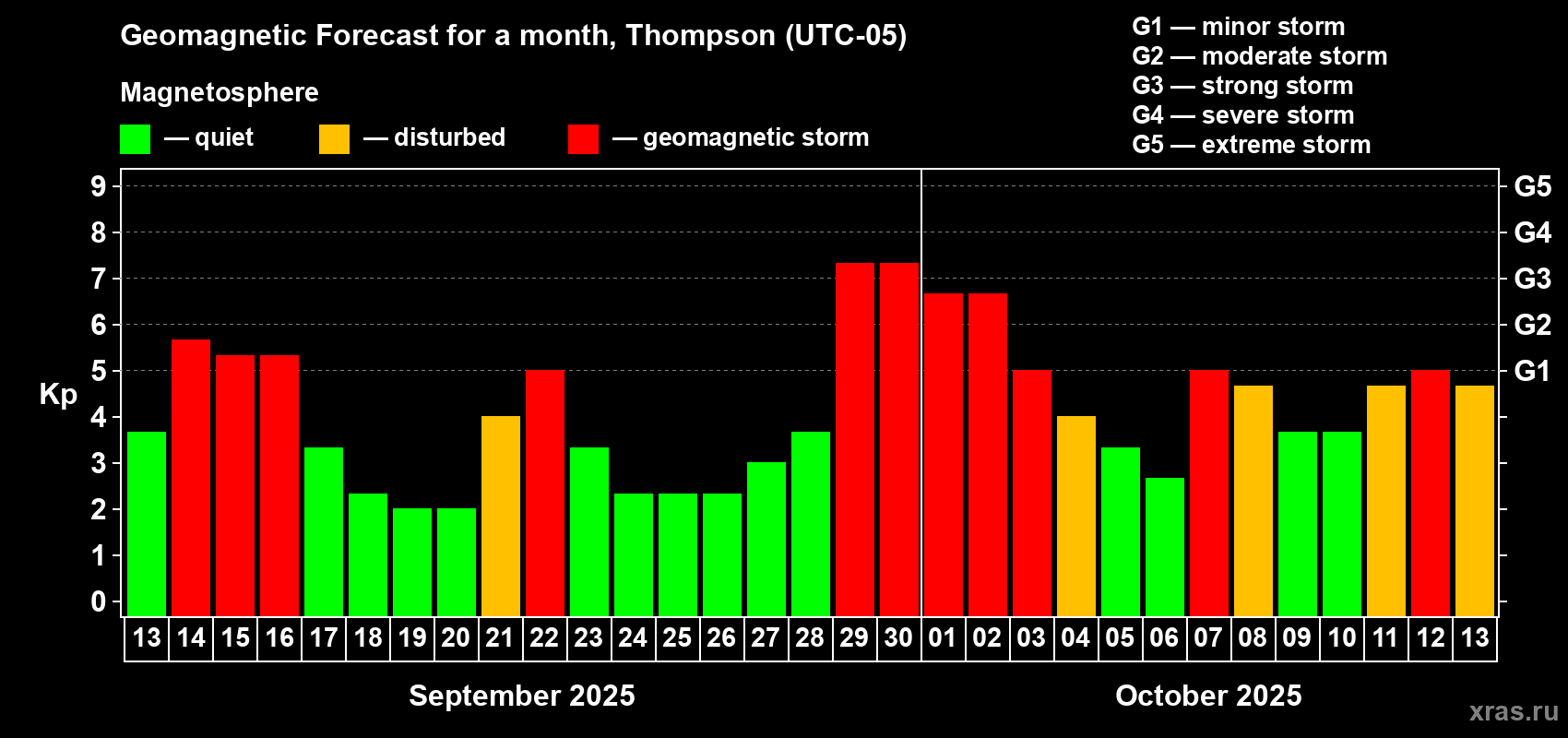 Geomagnetic storm forecast in Thompson for Sep 13, 2025