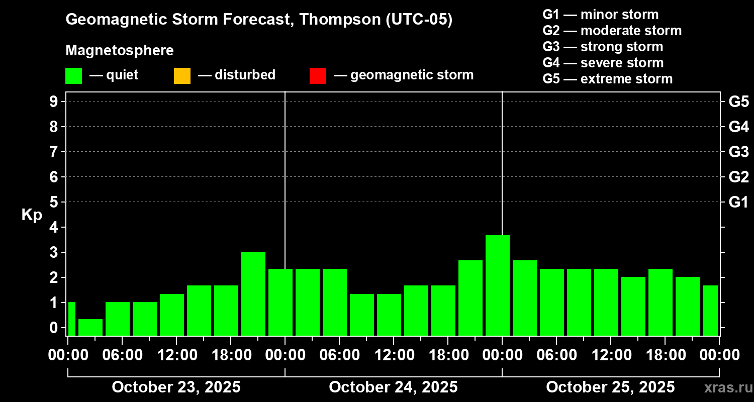 Geomagnetic storm forecast in Thompson for Oct 23, 2025