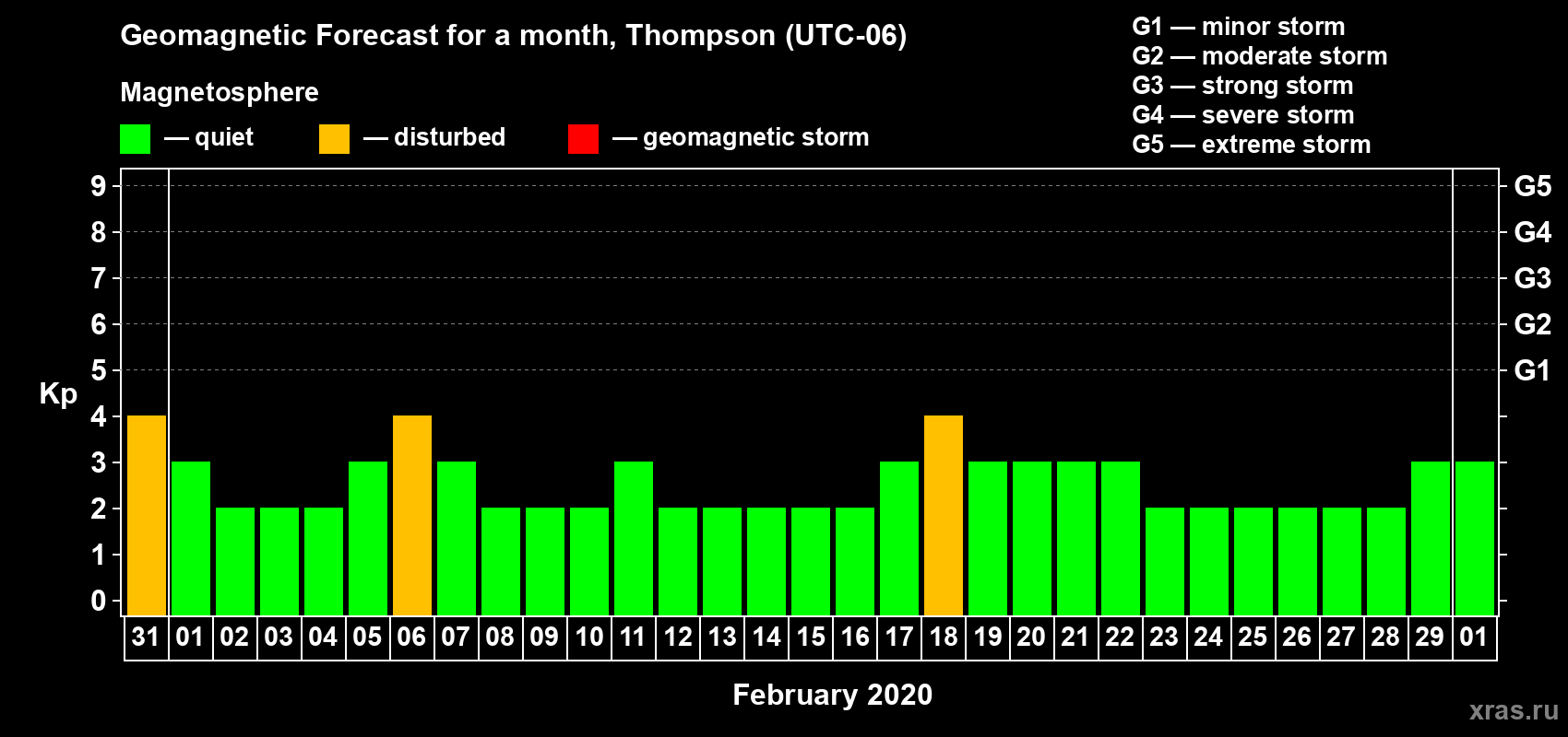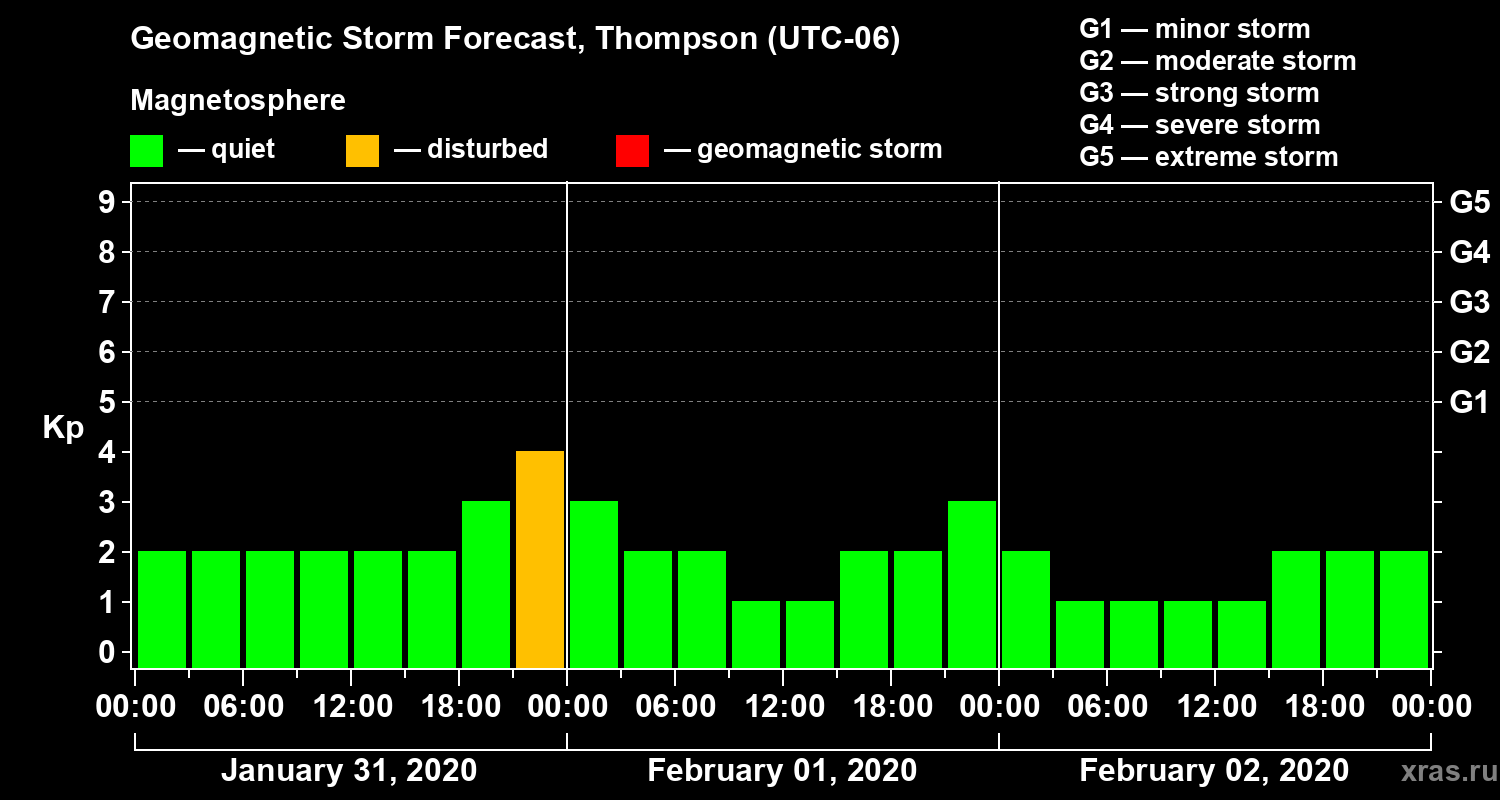 Geomagnetic storm forecast in Thompson for Jan 31, 2020