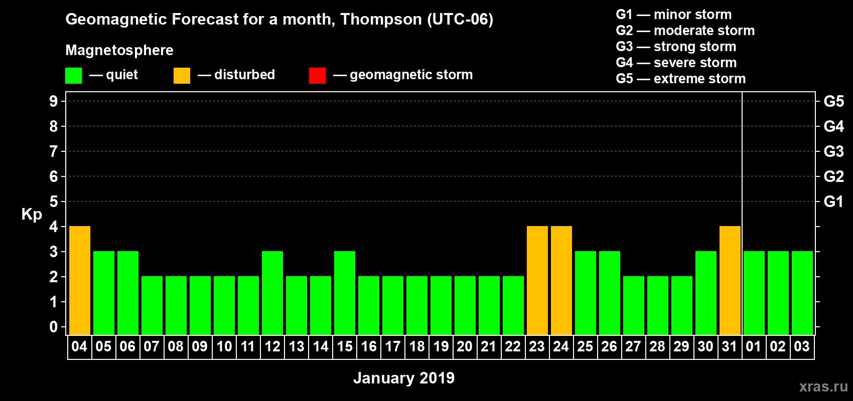 Geomagnetic storm forecast in Thompson for Jan 04, 2019