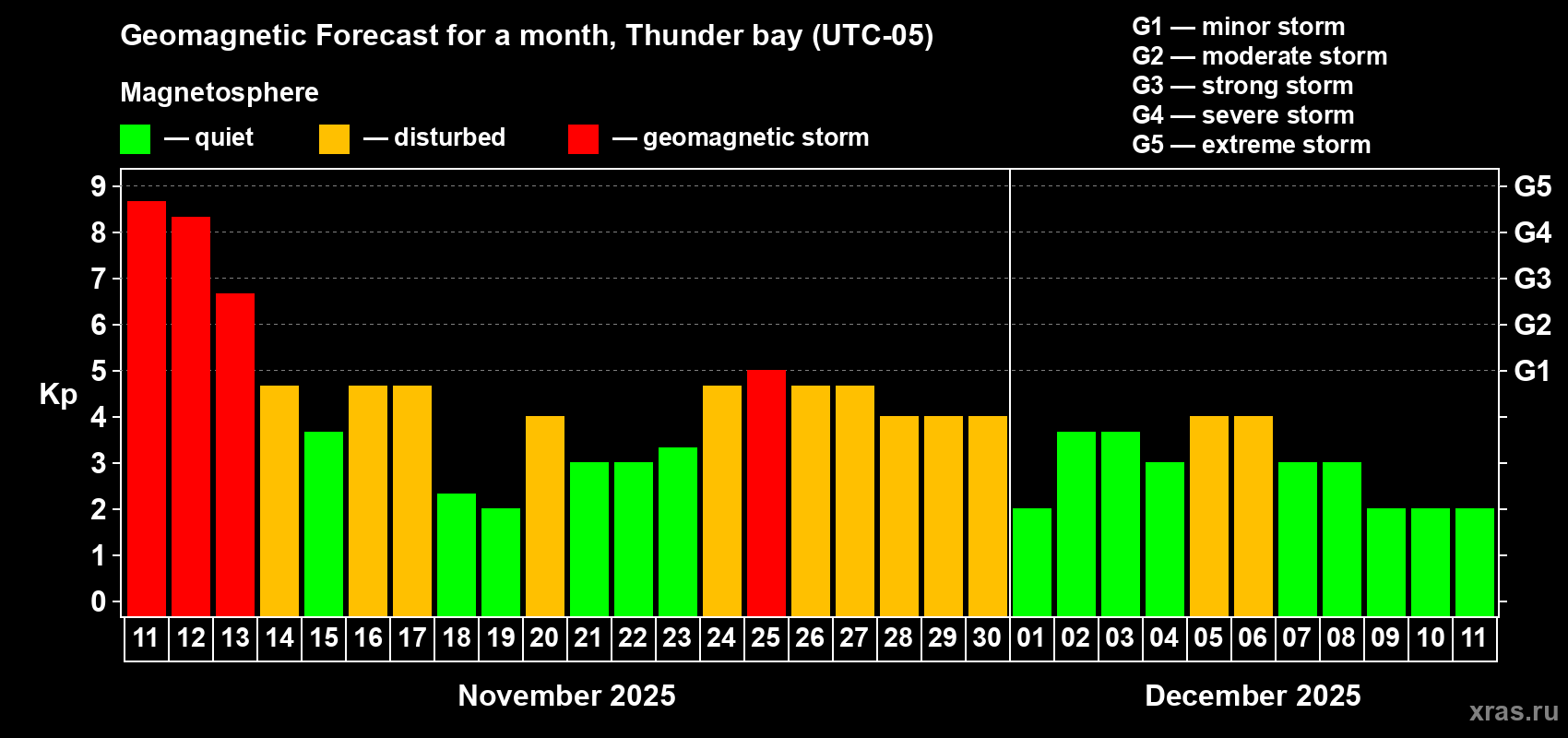 Geomagnetic storm forecast in Thunder bay for Nov 11, 2025