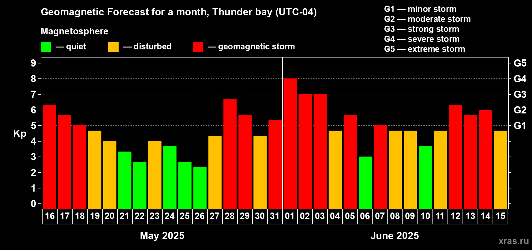 Geomagnetic storm forecast in Thunder bay for May 16, 2025