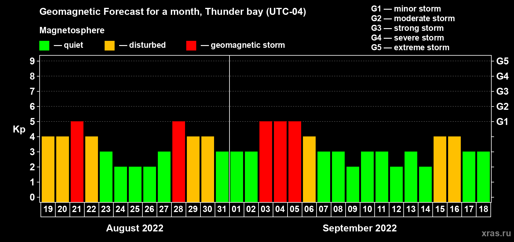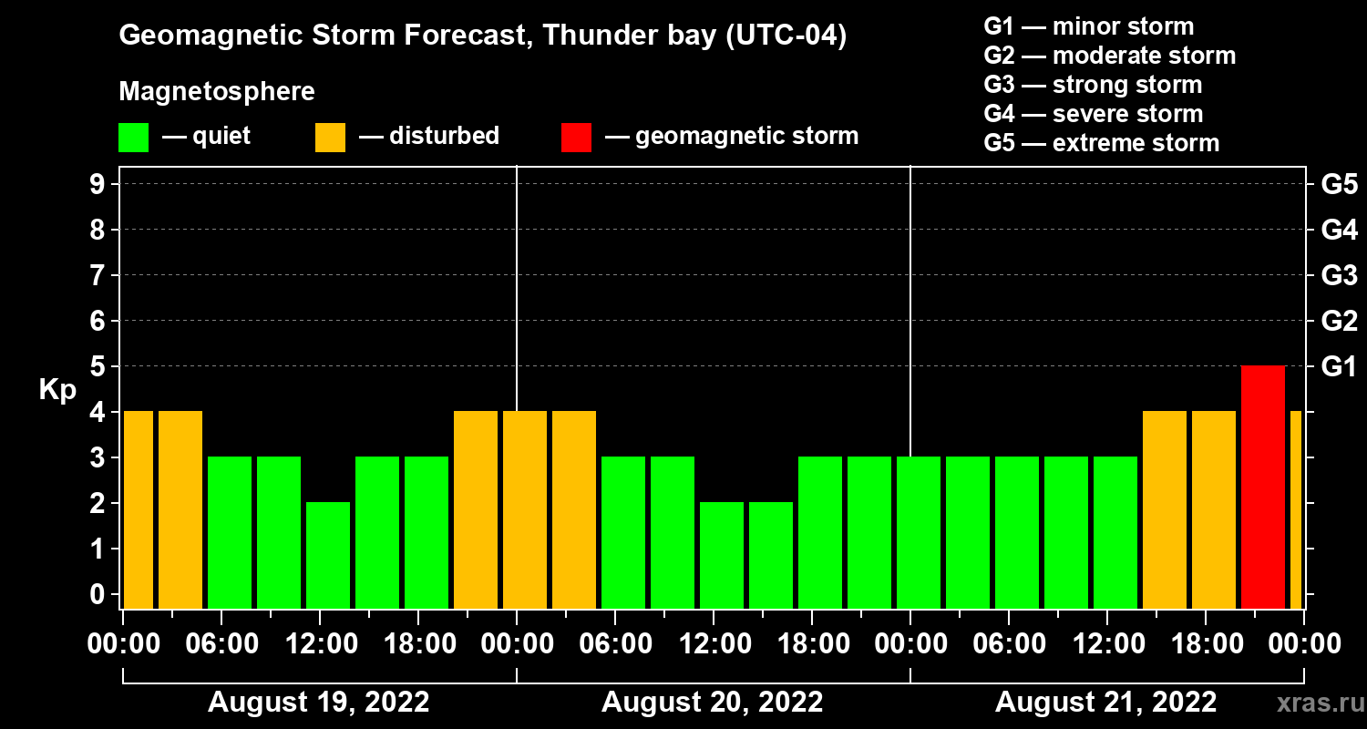Geomagnetic storm forecast in Thunder bay for Aug 19, 2022