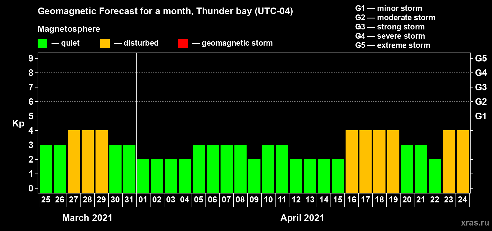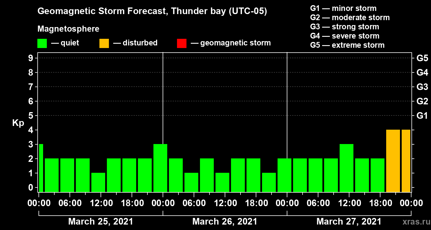 Geomagnetic storm forecast in Thunder bay for Mar 25, 2021
