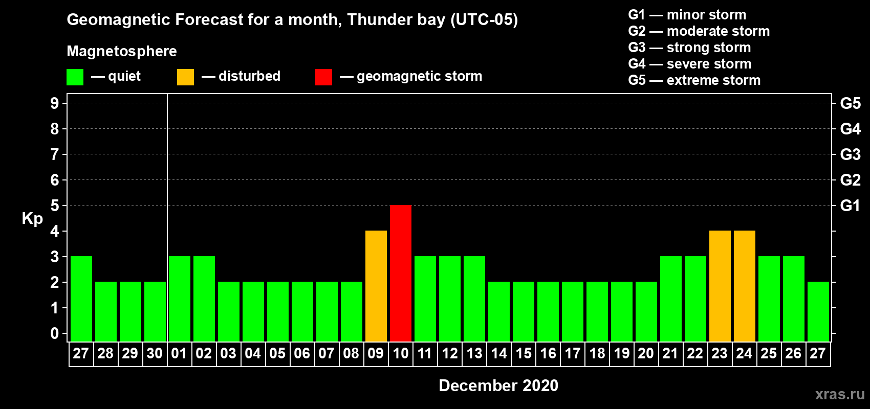 Geomagnetic storm forecast in Thunder bay for Nov 27, 2020