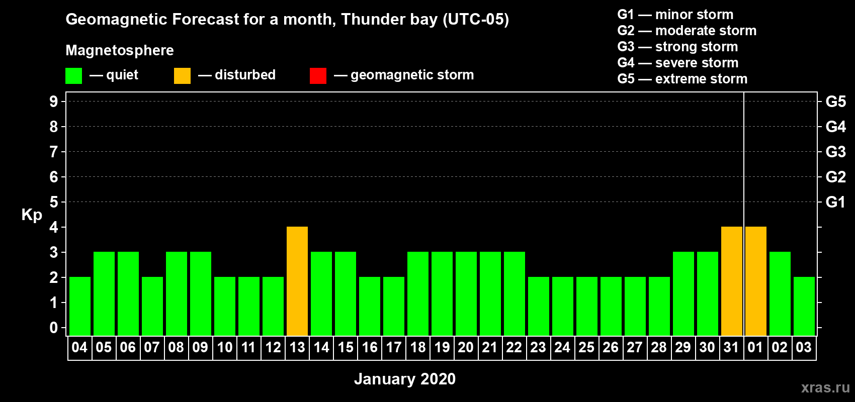 Geomagnetic storm forecast in Thunder bay for Jan 04, 2020
