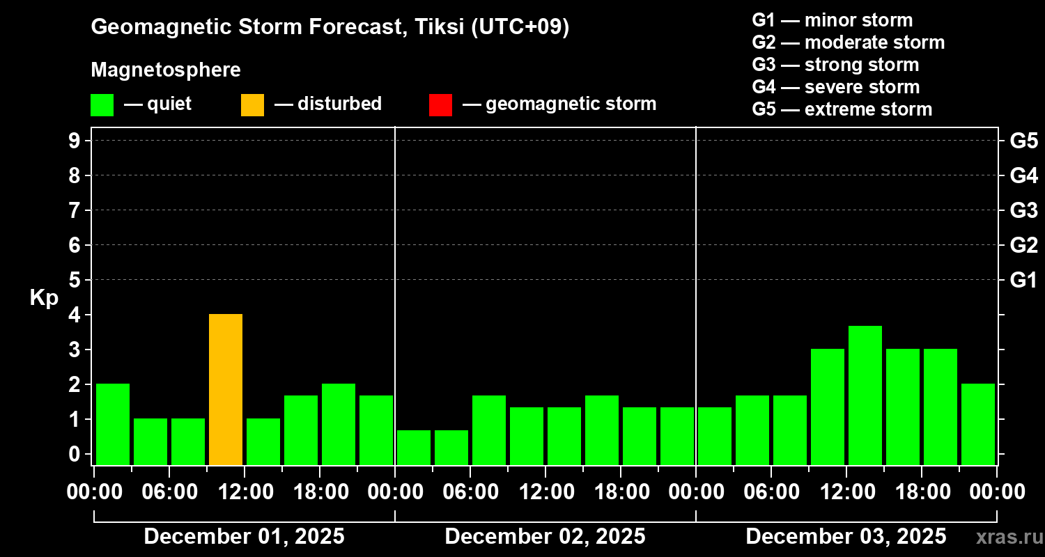 Geomagnetic storm forecast in Tiksi for Dec 01, 2025