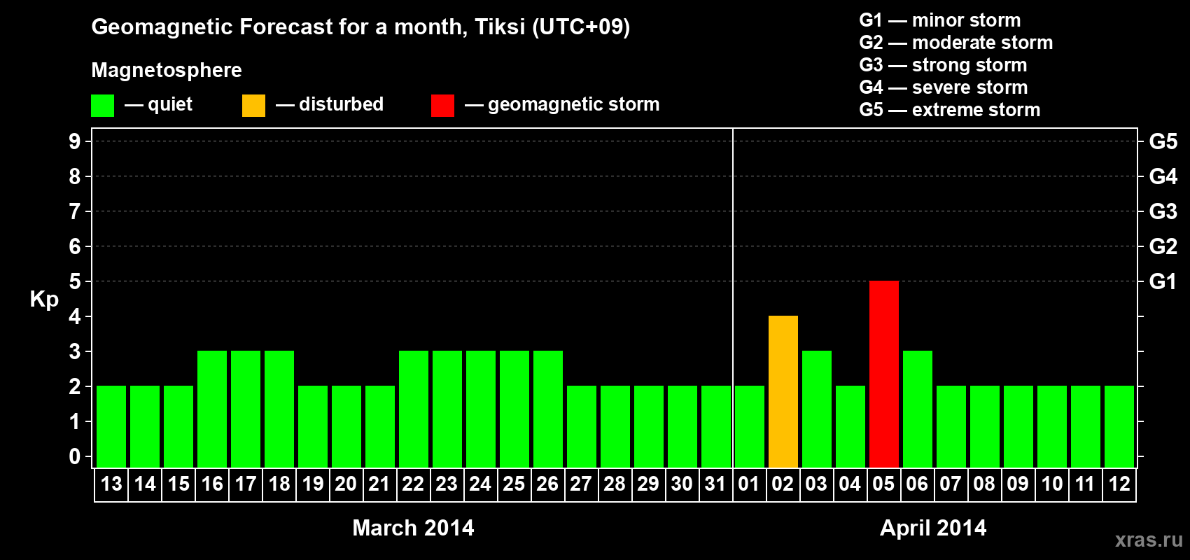 Geomagnetic storm forecast in Tiksi for Mar 13, 2014
