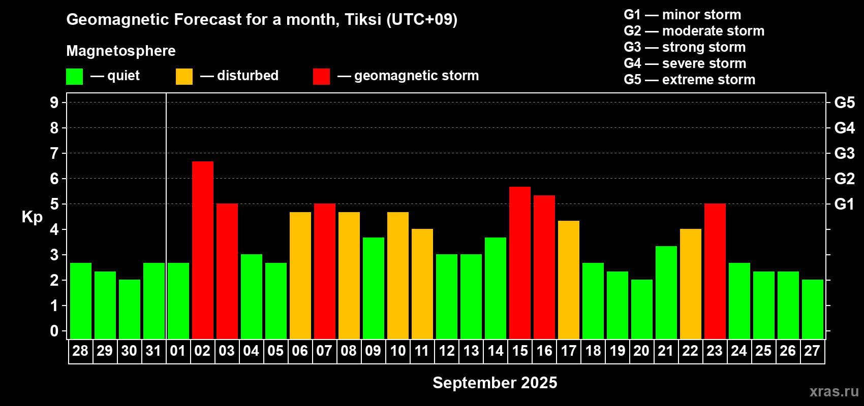 Geomagnetic storm forecast in Tiksi for Aug 28, 2025
