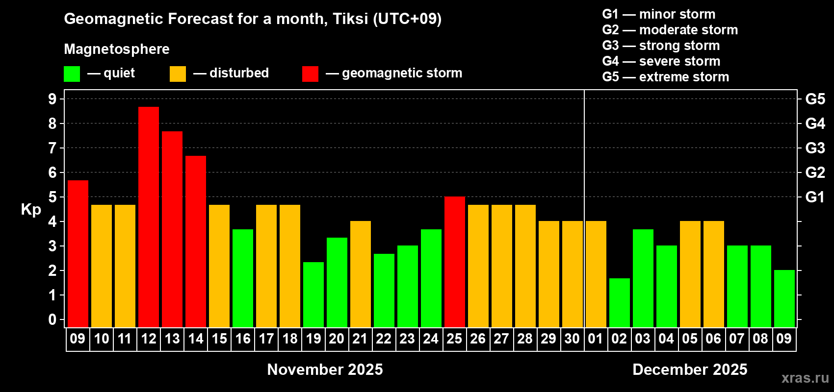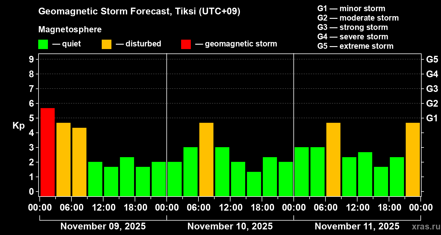 Geomagnetic storm forecast in Tiksi for Nov 09, 2025