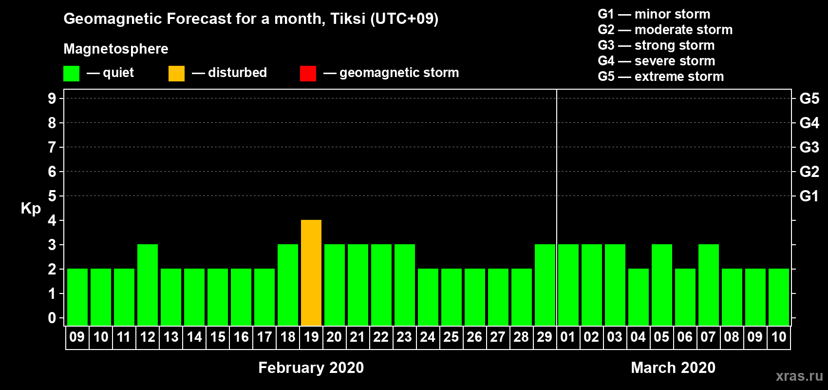Geomagnetic storm forecast in Tiksi for Feb 09, 2020