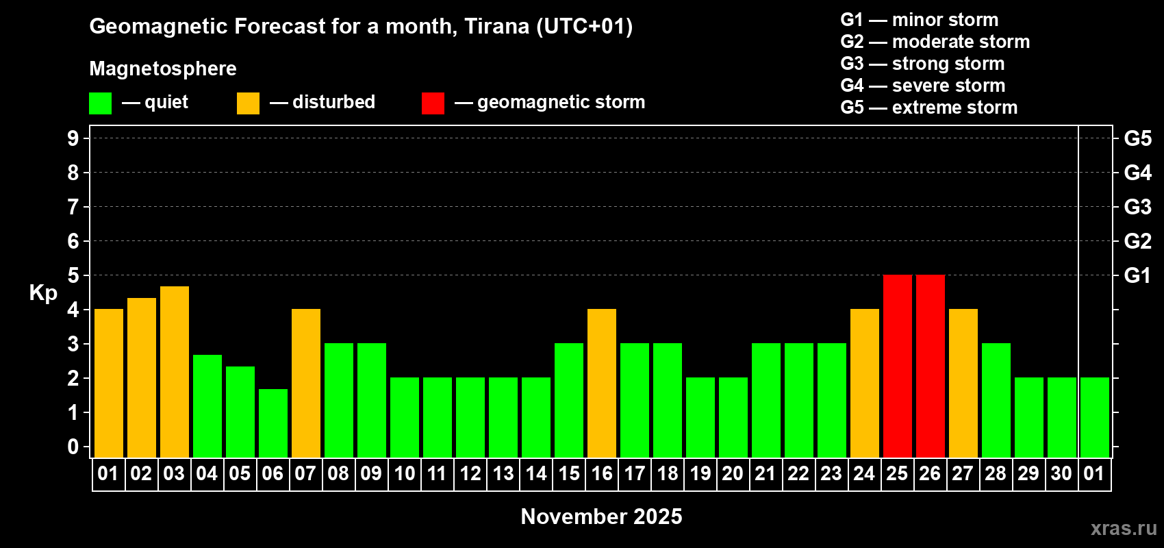 Geomagnetic storm forecast in Tirana for Nov 01, 2025