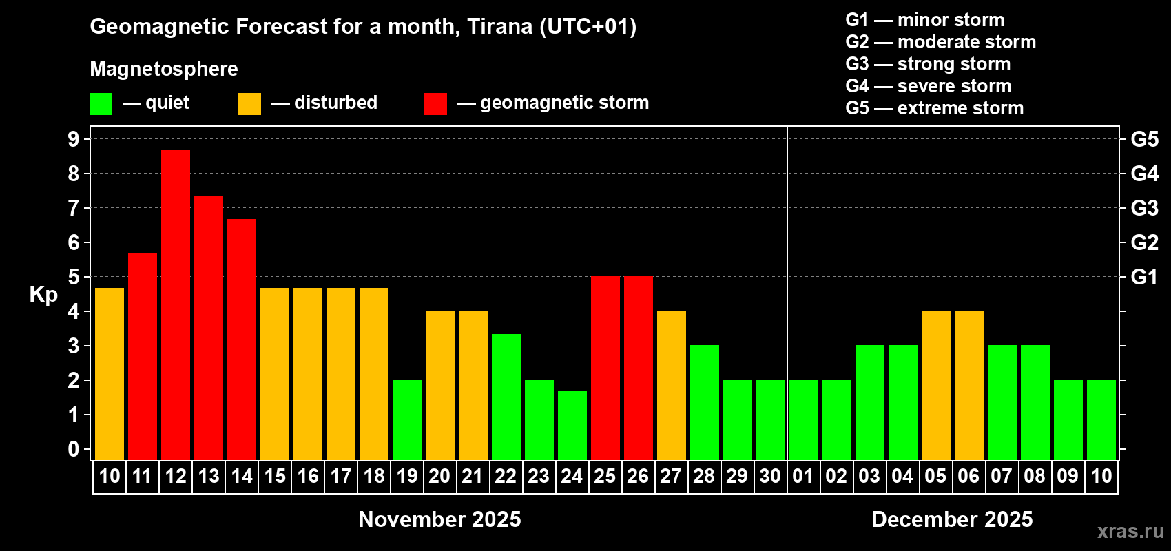 Geomagnetic storm forecast in Tirana for Nov 10, 2025