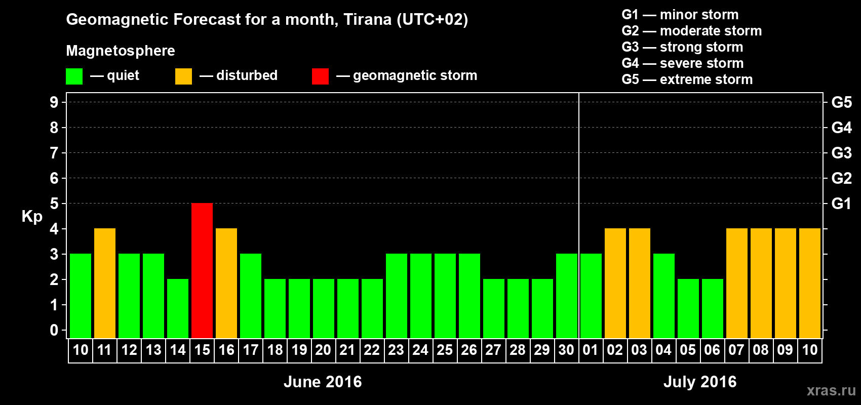 Geomagnetic storm forecast in Tirana for Jun 10, 2016